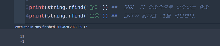 rfind는 특정 단어가 마지막으로 나타나는 위치를 알려준다. find와 마찬가지로 만약 해당 단어가 없다면 -1을 리턴한다.