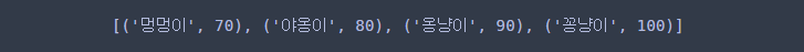 l = [('꽁냥이', 100), ('야옹이', 80), ('옹냥이', 90), ('멍멍이', 70)]