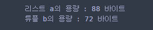 print(f'튜플 b의 용량 : {getsizeof(b)} 바이트')