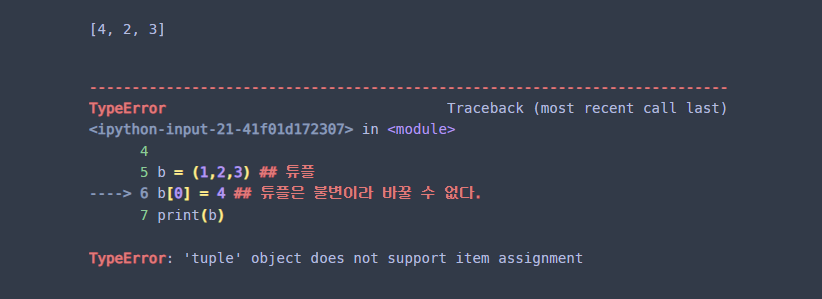 b[0] = 4 ## 튜플은 불변이라 바꿀 수 없다.