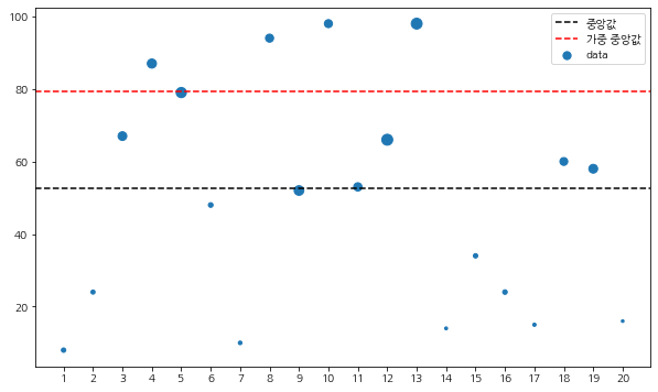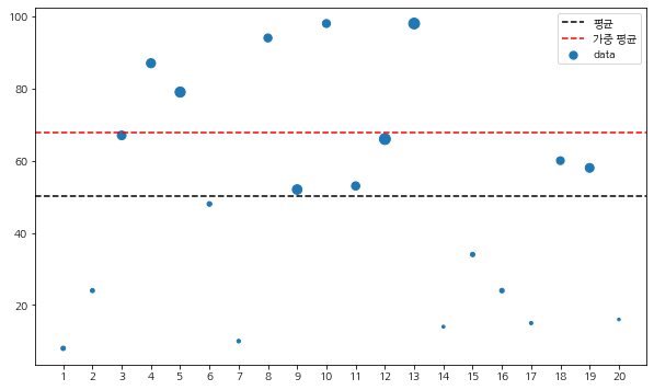 이제 일반 평균과 가중 평균이 어떻게 차이가 나는지 확인해보자. 아래 코드는 20개의 데이터와 가중치를 생성하고 평균과 가중 평균의 차이를 나타낸 것이다. 이때 각 데이터의 점 크기는 가중치에 비례하여 그리게 하였다.