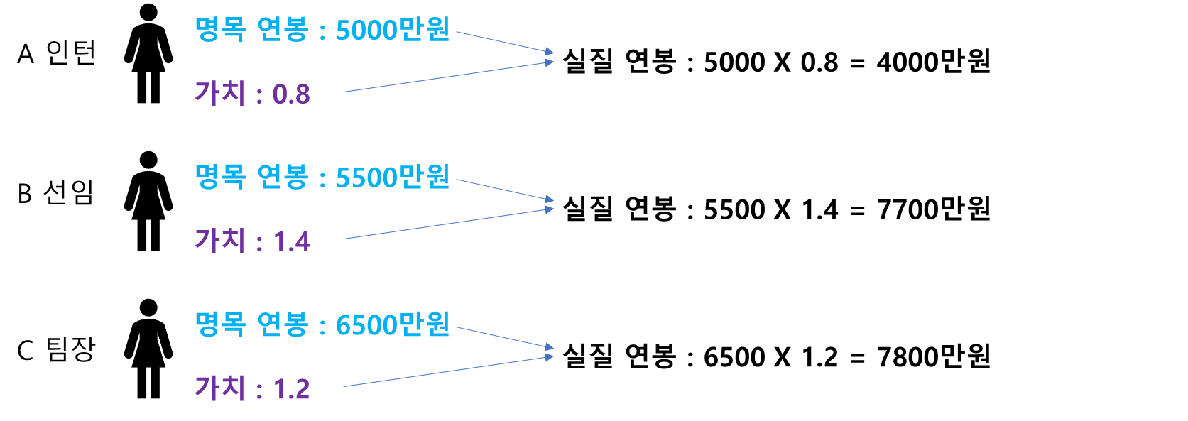 이때 3사람의 평균 연봉을 계산할 때 명목 연봉으로 계산하는 것보다 각 사람들의 가치를 반영한 실질 연봉으로 계산하는 것이 더 합리적일 것이다. 참고로 명목 연봉의 평균은 5667만원, 가치를 반영한 실질 연봉의 평균은 5735만원이며 계산식은 아래와 같다.