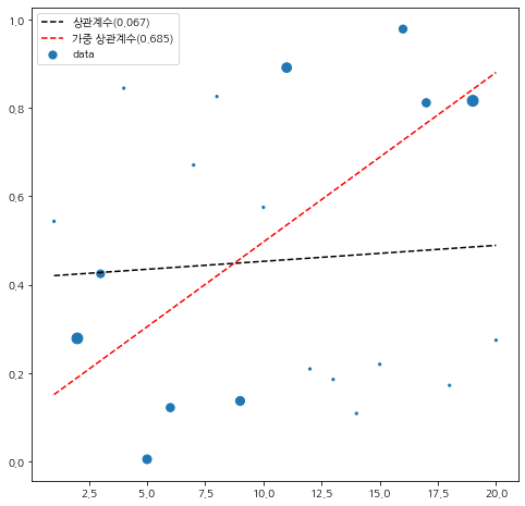 가중 상관 계수는 가중치가 낮은 데이터에는 덜 영향을 받고 가중치가 높은 데이터 위주로 상관성을 보게된다. 이에 대한 실험을 해보자. 20개 데이터를 생성했고 $x_i$은 1부터 20까지 부여하고 $y_i$ 표준균등분포에서 랜덤하게 생성했다. 이때 가중치 $w_i$는 데이터 평균($\bar{x}, \bar{y}$)을 중심으로 좌하단과 우상단 영역의 데이터 가중치를 크게 주었다. 또한 직선을 추가하기 위해 최소 제곱 단순 회귀 모형과 가중 최소 제곱 단순 회귀 모형을 적합하였다.