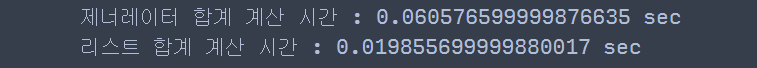 print('제너레이터 합계 계산 시간 :', sum_with_generator(range(1000000)), 'sec')