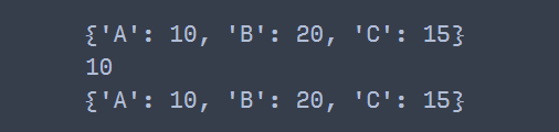 ## 'A'라는 키는 이미 있으므로 기존 딕셔너리는 바뀌지 않으며 'A'가 갖고 있는 10을 반환한다.