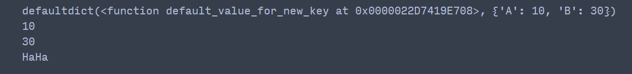 print(dict_test['C']) ## 'C'키는 존재하지 않으므로 기본 값을 'HaHa' 출력