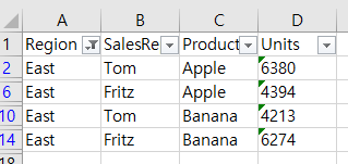 ws.auto_filter.add_filter_column(0, ['East']) ## 첫 번째 칼럼에서 East인 것들만 필터링한다.