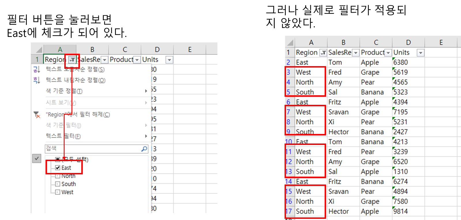 하지만 실제로 파일을 열어보면 필터 버튼에서 'East'는 표시되어 있지만 'East'가 아닌 'West', 'North', 'South' 값도 표시되어 있다. 즉, 필터가 적용되지 않은 것이다.