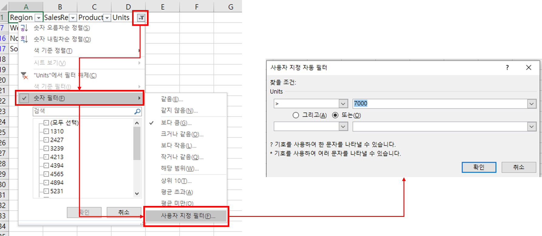 위 코드를 수행하고 필터링 버튼 클릭 -> 숫자 필터 -> 사용자 지정 필터로 들어가면 우리가 정의한 필터 조건식이 들어가 있음을 확인할 수 있다.