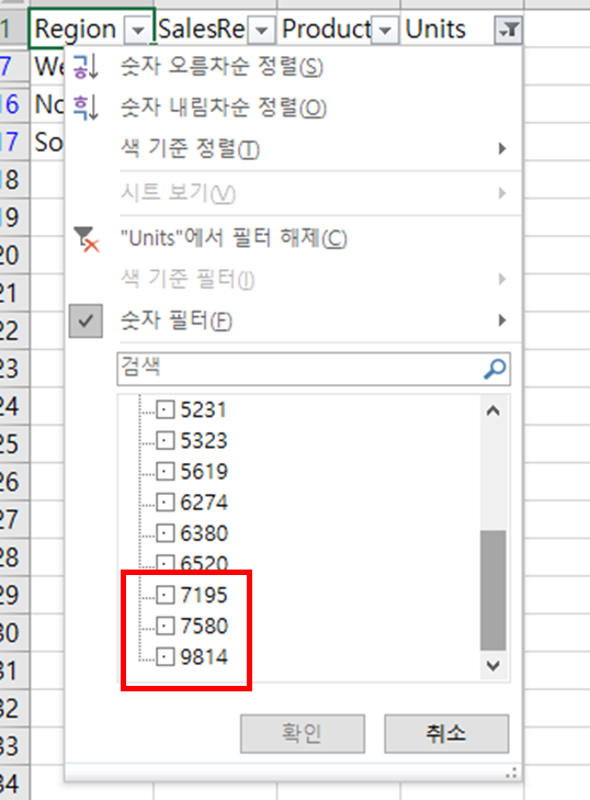 아래 그림과 같이 조건을 만족하는 7195, 7580, 9814 값이 체크가 안되어 있었다. 이게 순서를 바꿔서 해봐도 문서를 참고해서 값을 설정해봐도 안됐다. 이게 사용자 지정 필터를 적용하면 체크 박스에 체크를 못하고, 체크 박스에 체크를 하면 사용자 지정 필터가 인식이 안되었다. 즉, 둘 중 하나는 포기해야 했다. 혹시 사용자 지정 필터와 체크 박스에 체크를 동시에 할 수 있는 방법을 아는 분이 있다면 알려주셨으면 좋겠다.