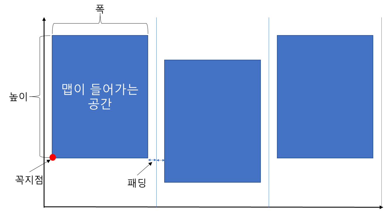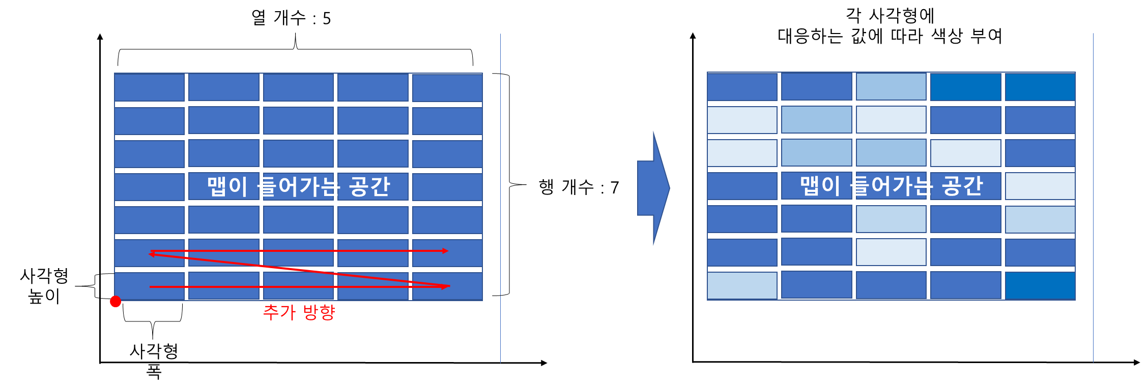 이제 각 공간 안에 히트맵을 넣어야 합니다. 히트맵은 다음과 같이 그려집니다. 먼저 열 개수와 행 개수를 지정합니다. 그에 따라 사각형 하나의 폭과 높이가 결정됩니다. 다음으로 아래 그림에서 빨간 점을 기준으로 사각형이 오른쪽으로 추가됩니다. 만약 최대 열에 도달하면 다시 한 칸 위로 올라간 다음 맨 왼쪽에서 오른쪽 방향으로 추가되지요.