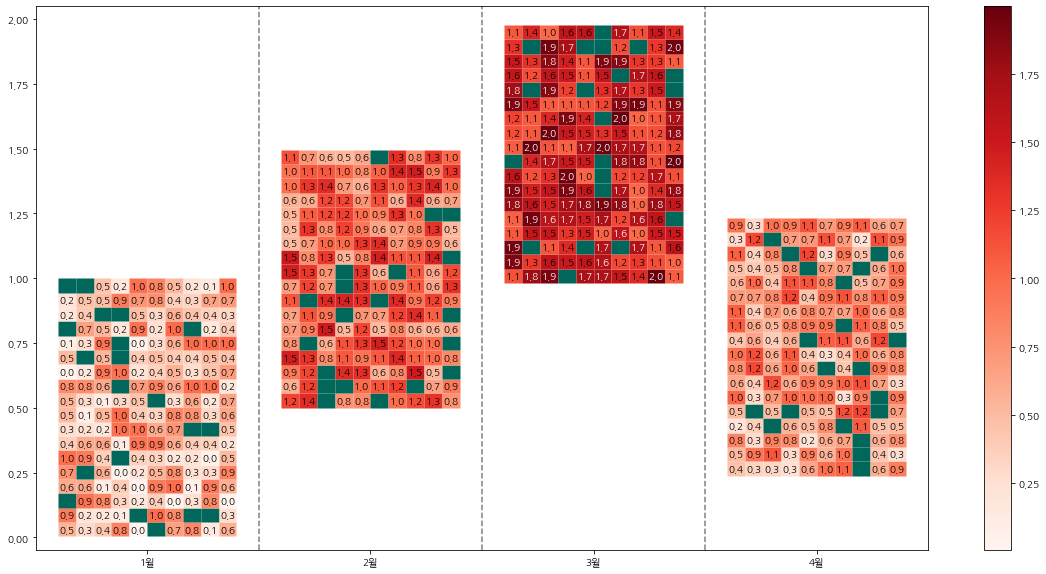 보통 히트맵은 한 좌표 축(Axes) 안에 그려지게 됩니다. 즉, 일반적인 방법으로는 한 좌표 축(Axes) 안에 그릴 수 없는데요. 하지만 히트맵의 구성 요소 하나하나는 사각형이고 히트맵은 이들의 집합이라는 점을 이해한다면 사각형 하나는 Rectangle로 히트맵은 이들의 집합인 PatchCollection으로 감싸준다면 하나의 axes 안에 여러 히트맵을 그릴 수 있습니다.