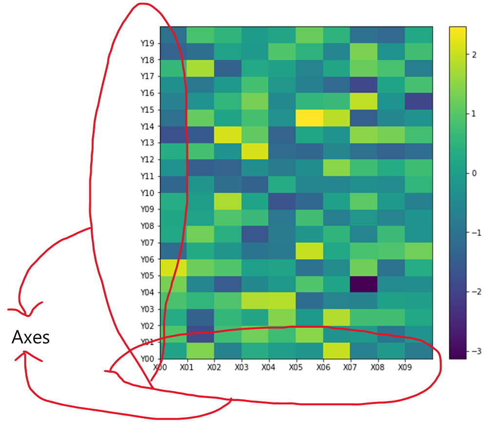 여기서 좌표 축(Axes)이라는 것은 x축(x-axis)과 y축(y-axis)를 포함하는 단어입니다. 꽁냥이가 아까 말씀드렸죠? 일반적으로 하나의 좌표 축 안에는 하나의 히트맵만 그릴 수 있다고요. 아래와 같이 말이죠.