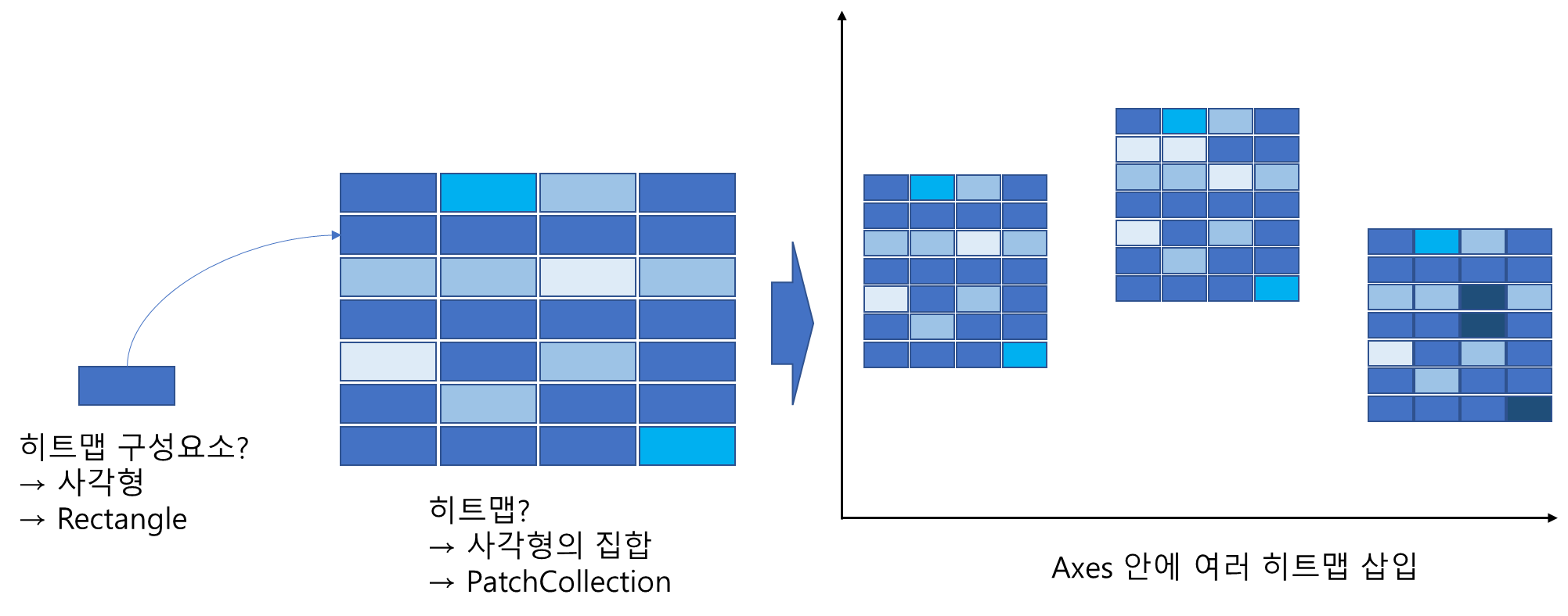 물론 있습니다. 일반적으로는 못그리지만 방법은 있습니다. 원리를 이해하기 위하여 아래 그림을 살펴보겠습니다. 먼저 히트맵 구성요소는 사각형(직사각형) 임을 알 수 있고요. 히트맵은 이러한 사각형의 모임(집합)으로 이루어져 있음을 알 수 있습니다. 이러한 집합을 원하는 개수만큼 만들어 한 좌표 축(Axes)에 삽입하면 되는 것이지요.
