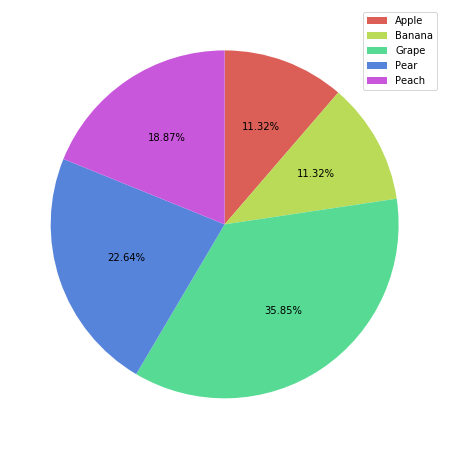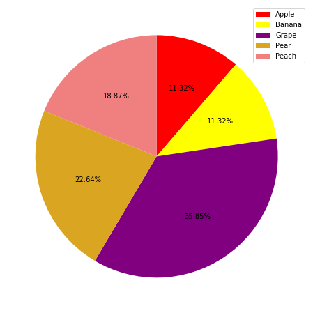 꽁냥이는 각 과일의 색상을 파이 차트로 표현하려고 해요. Matplotlib에서 사용할 수 있는 색상이 궁금하시다면 여기를 참고하세요.