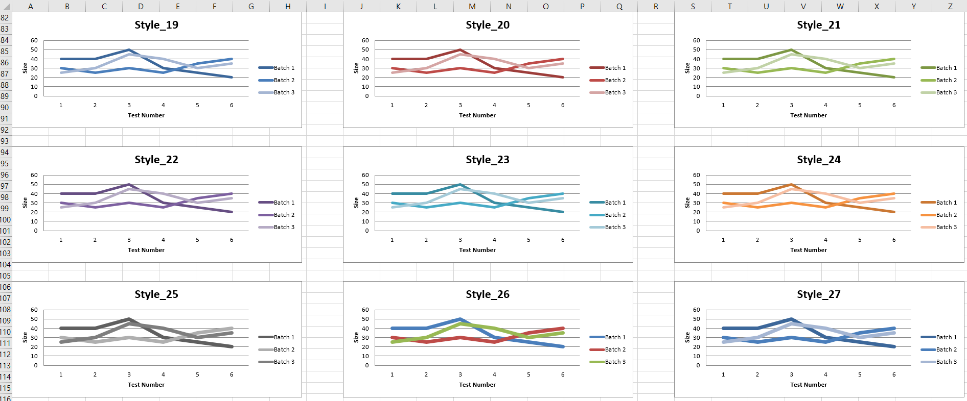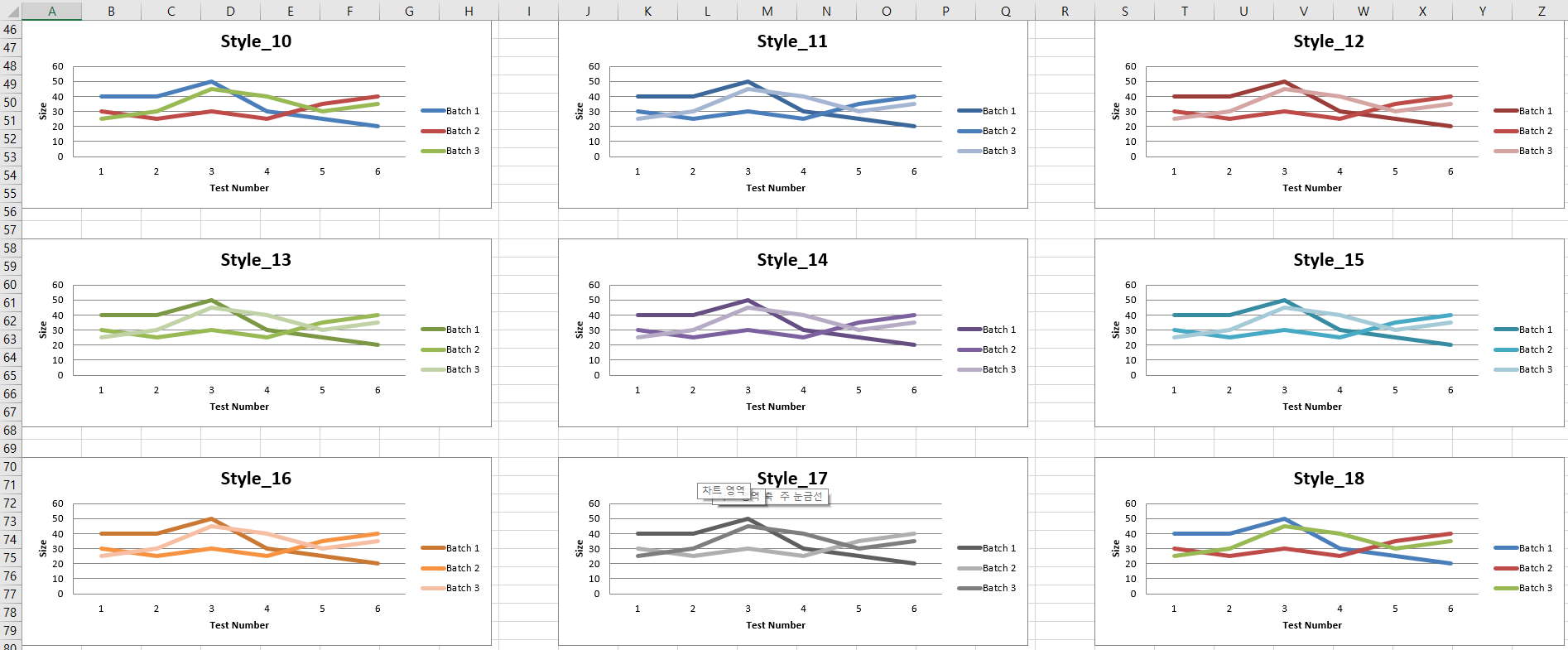 앞에서 말했듯이 style은 1~48까지의 정수를 입력할 수 있으며 각 숫자마다 차트 배경색, 라인 두께, 라인 색상 등 사전에 설정된 차트 스타일을 적용할 수 있다. 아래 그림을 통해 각 숫자가 어떤 스타일인지 확인해볼 수 있으므로 각자 취향에 맞는 스타일을 선택하면 된다.