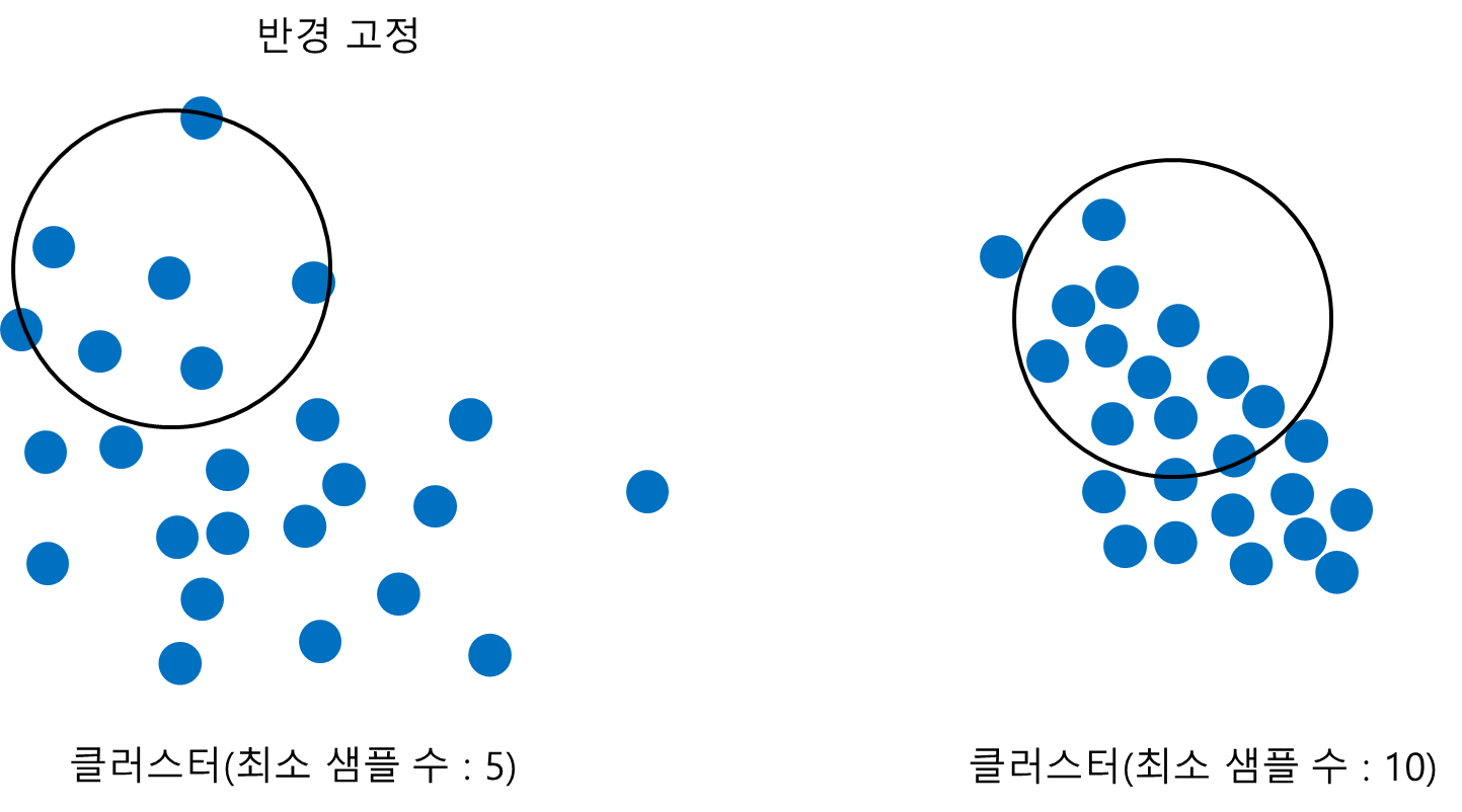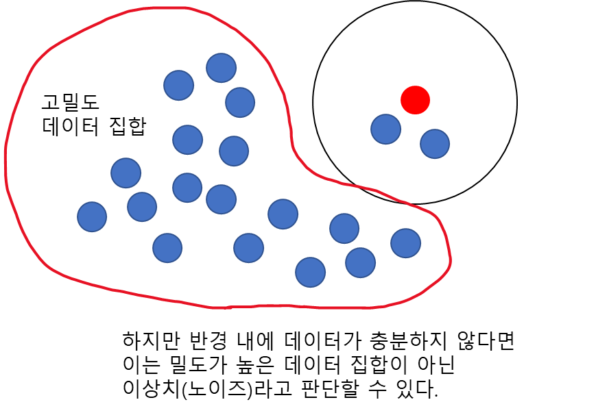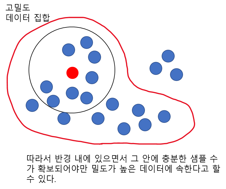 당연하게도 한 데이터가 밀도가 높은 데이터 집합에 속한다면 그 데이터를 중심으로 (작은) 사전에 정해둔 반경 내에 데이터가 포함되어 있어야 할 것이다.
