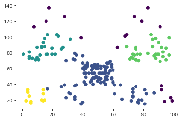 다음으로 Scikit-Learn에서 제공하는 DBSCAN 클래스를 이용하여 클러스터를 할당해보았다. DBSCAN 클래스를 초기화할 때 반경 eps, 최소 샘플 수 min_samples를 설정한 뒤 fit 메서드를 호출하여 클러스터링을 수행한다.