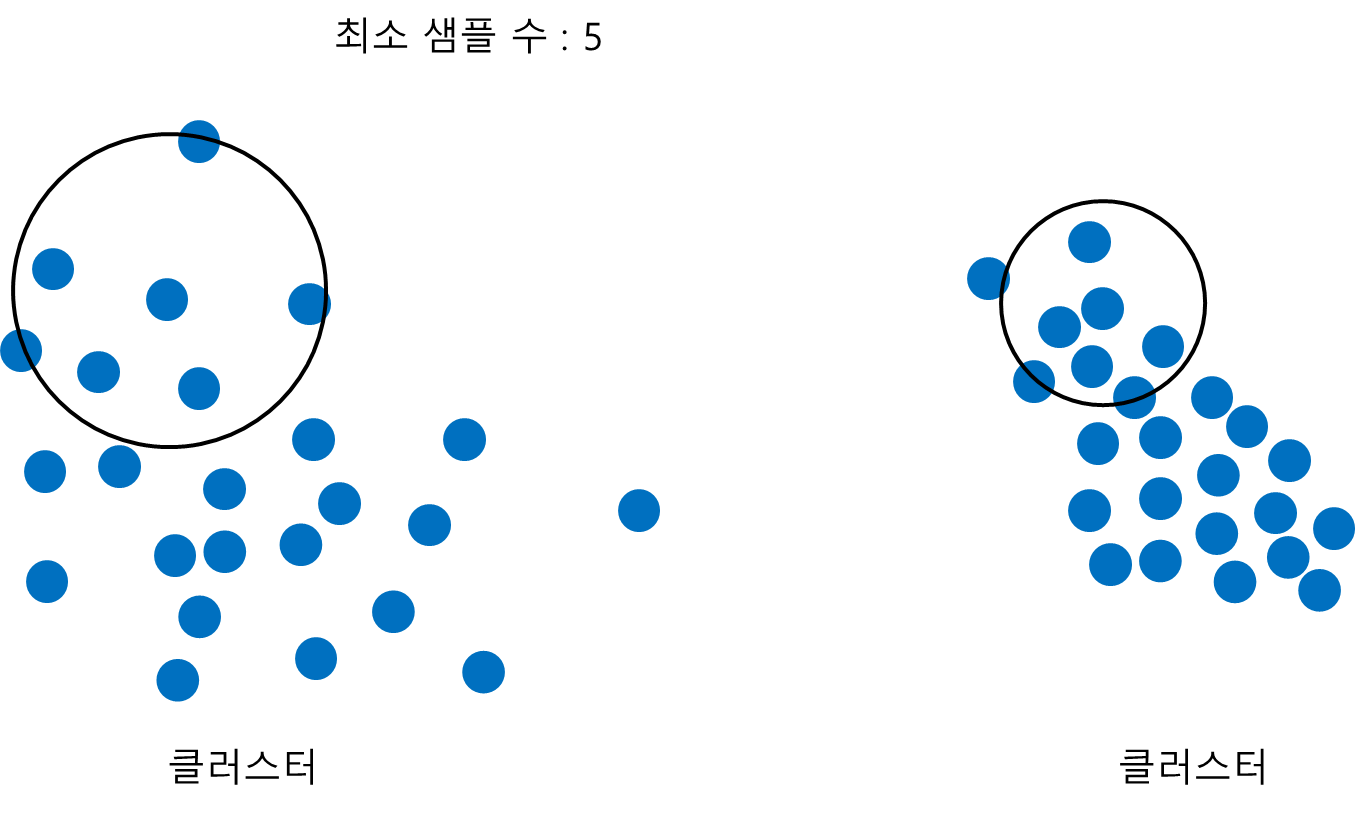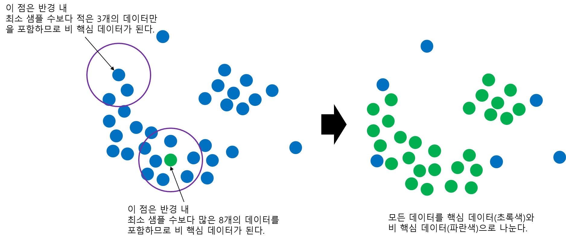 왼쪽 그림의 경우 회색점이 초록색 점들과 촘촘하게 이어진(밀도가 높은) 클러스터이며 굉장히 자연스럽다. 하지만 오른쪽의 경우 보라색 점들 사이에는 촘촘하게 이어져있지만 회색 점들을 포함시키면 중간에 빈 공간(밀도가 낮은 공간)이 생겨 어색하다.