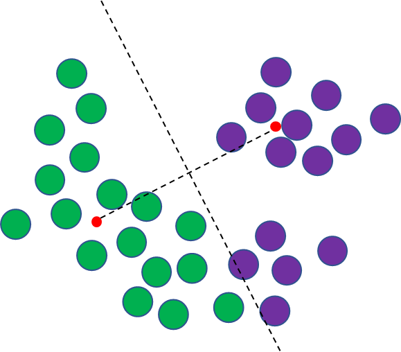 K-means 알고리즘은 중심과 데이터의 거리 기반에 따른 클러스터링 알고리즘이다. 이에 따라 아래 그림에서 빨간 점이 두 클러스터의 중심으로 주어진 경우 각 데이터들은 중심과 가까운 쪽의 클러스터로 할당될 것이다. 2차원의 경우 두 중심을 이은 선분의 수직 이등분선이 클러스터를 나누는 경계가 된다.