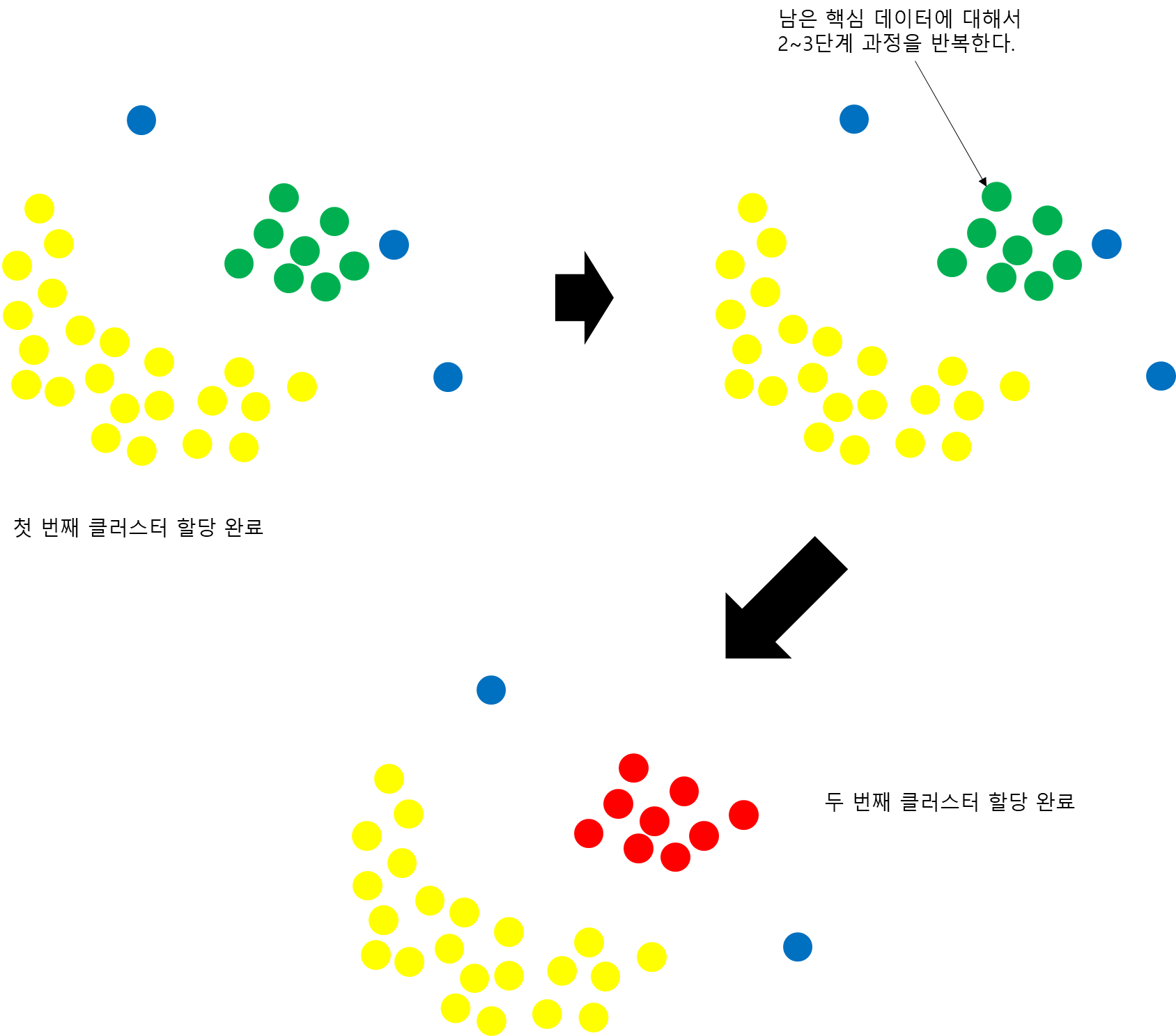 아직 끝나지 않았다. 비 핵심 데이터 중에서 핵심 데이터로 이루어진 클러스터에 가까운 것들은 클러스터에 포함시키는 것이다.