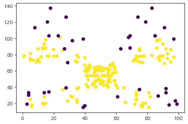 ax.scatter(df['Spending_Score'], df['Annual_Income'], c=is_core_samples)