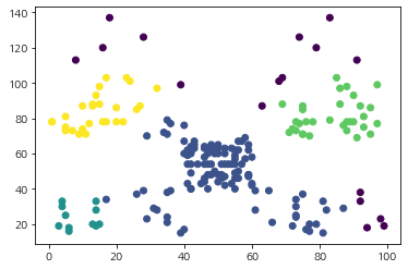 cluster = DBSCAN(eps=10, min_samples=5).fit(X)