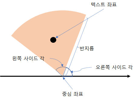 텍스트 x좌표 = (반지름/2) X cos{(오른쪽 사이드각+왼쪽 사이드 각)/2} + 중심 x좌표