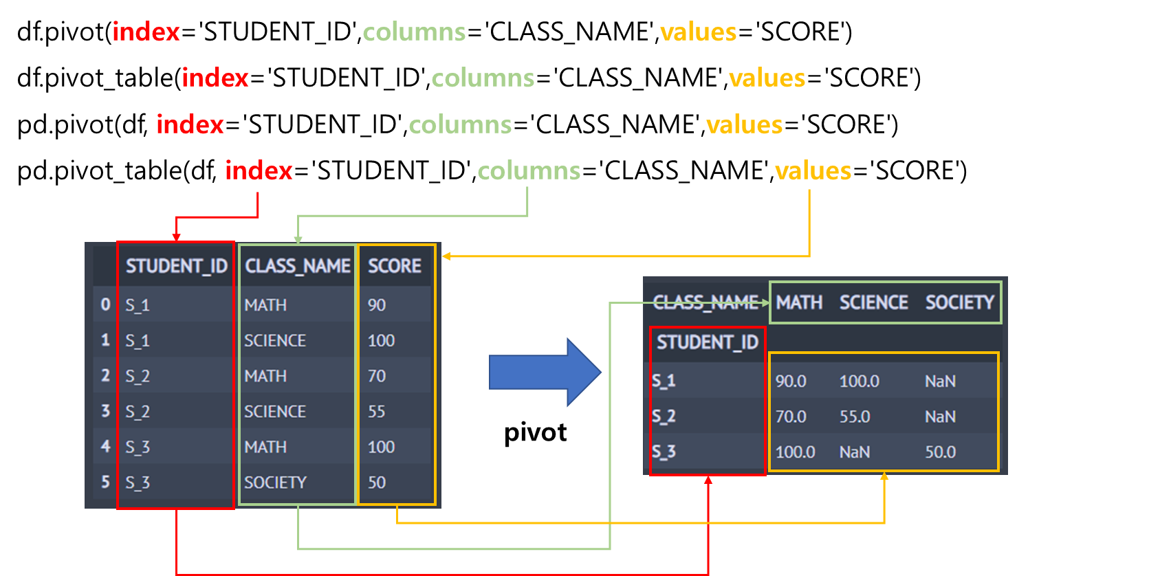 아래 그림은 pivot 또는 pivot_table 메서드를 이용한 데이터 재구조화 결과를 나타낸 것입니다. pivot 또는 pivot_table 메서드는 기본적으로 index, columns, values 3개의 인자를 가지며 각 인자에는 칼럼명을 전달합니다. index로 지정된 칼럼은 해당 칼럼에 대응하는 유니크한 값(조합)들이 인덱스로 바뀝니다(빨간색 선, 박스). columns로 지정된 칼럼은 해당 칼럼에 대응하는 유니크한 값(조합)의 개수만큼 새로운 칼럼들이 만들어집니다(연두색 선, 박스). values로 지정된 칼럼은 앞서 만들어진 index와 columns에 대응하는 값으로 셀에 채워지게 됩니다(주황색 선, 박스). 이때 대응되는 값이 없으면 NaN으로 채워집니다.