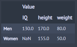 위 결과를 보면 Women에는 IQ에 대응하는 값이 없기 때문에 NaN로 처리됩니다. 이를 다른 값으로 대체하고자 한다면 fill_value 인자를 사용하면 됩니다. 아래 코드는 NaN를 100으로 대체한 것입니다.