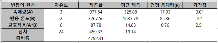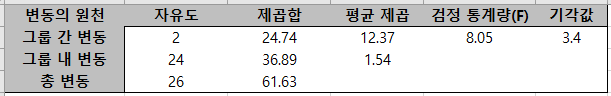 그리고 유의 수준 $\alpha = 0.05$에 대한 기각값 $F_{0.05}(2, 24) = 3.40$이다. 이제 다음의 테이블을 정리할 수 있다(ANOVA Table이라고도 한다).