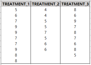 이 경우 $k=3, n_1 = 10, n_2 = 8, n_3 = 9, n = n_1+n_2+n_3 = 27$이다. 또한 전체 평균과 그룹 평균은 다음과 같다.