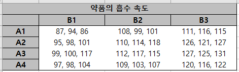 이제 예제를 통해서 Two Way ANOVA를 수행해보자. 어떤 약품의 흡수 속도는 촉매량($A$)과 반응 온도($B$)에 따라 달라진다고 추측하고 있다. 이때 촉매량은 4가지 수준, 반응 온도는 3가지 수준에서 약품의 흡수 속도를 관측한 결과 다음과 같은 자료를 얻었다.