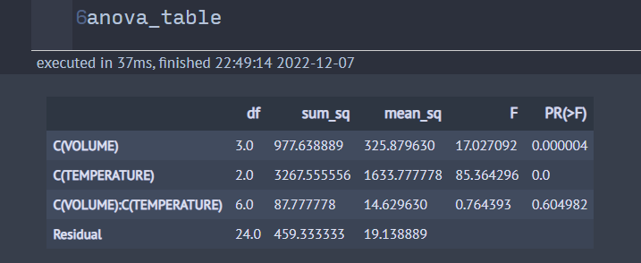 이원분산분석 방법은 일원분산분석과 거의 동일하나 VOLUME과 TEMPERATURE의 교호작용을 나타내기 위해 formula 중에서 'C(VOLUME):C(TEMPERATURE)'에 콜론(:)이 사용되었다는 점을 주목하자.