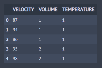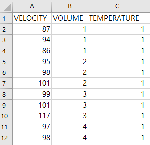 이번에는 촉매량(VOLUME)의 4가지 수준과 반응 온도(TEMPERATURE) 3가지 수준에 따른 약품의 흡수 속도(VELOCITY)에 차이가 있는지 확인해보고자 한다. 아래는 데이터의 일부를 나타낸다. 이때 이원분산분석(Two Way ANOVA)을 해보자.