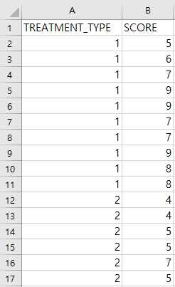 아래와 같이 세가지 학습 방법(TREATMENT_TYPE)에 따른 국어 성적(SCORE) 데이터가 있다고 할 때 일원분산분석(One Way ANOVA)을 해보자.