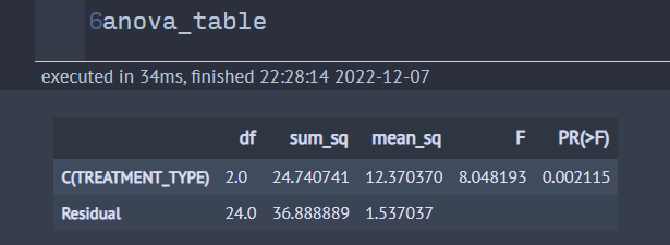 이제 코드를 실행하면 아래와 같이 ANOVA Table이 잘 출력되는 것을 볼 수 있다.