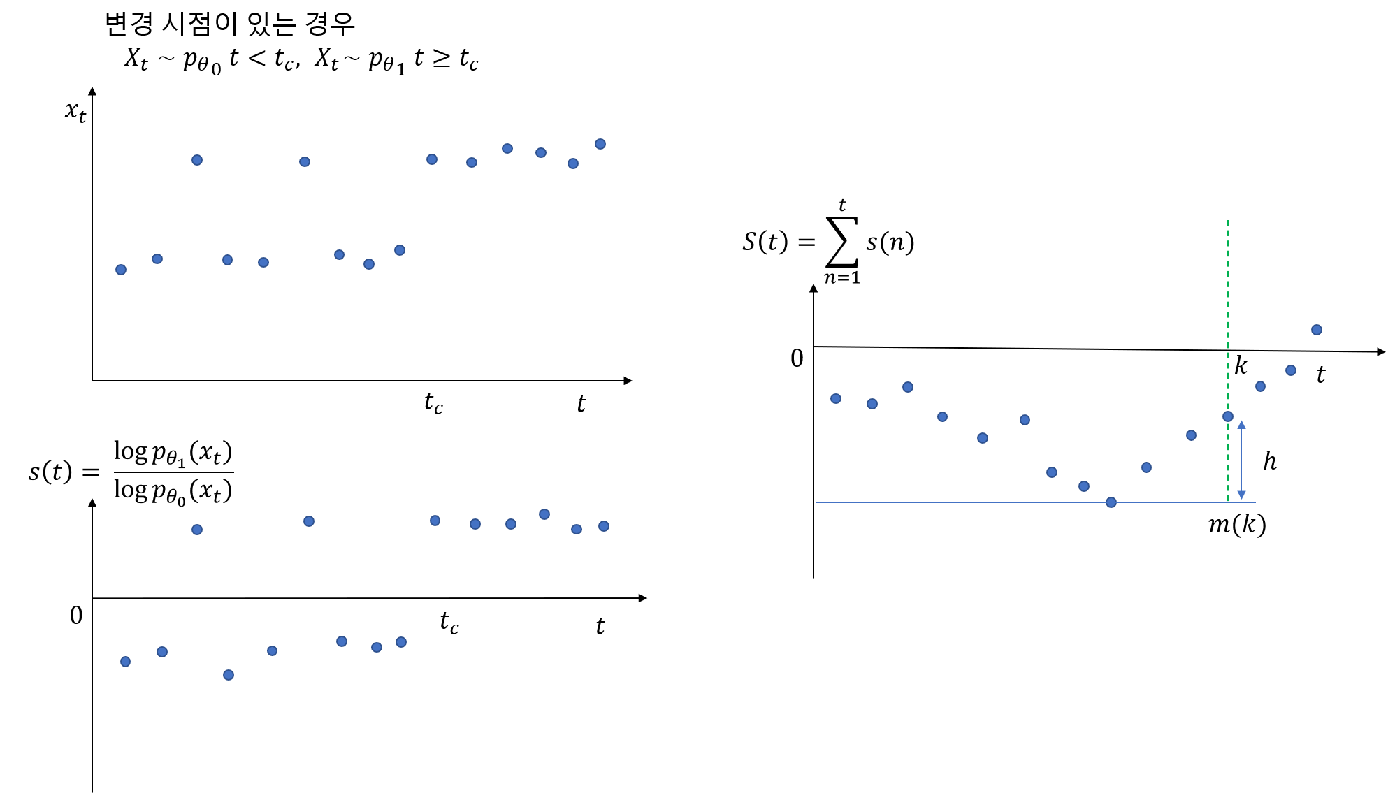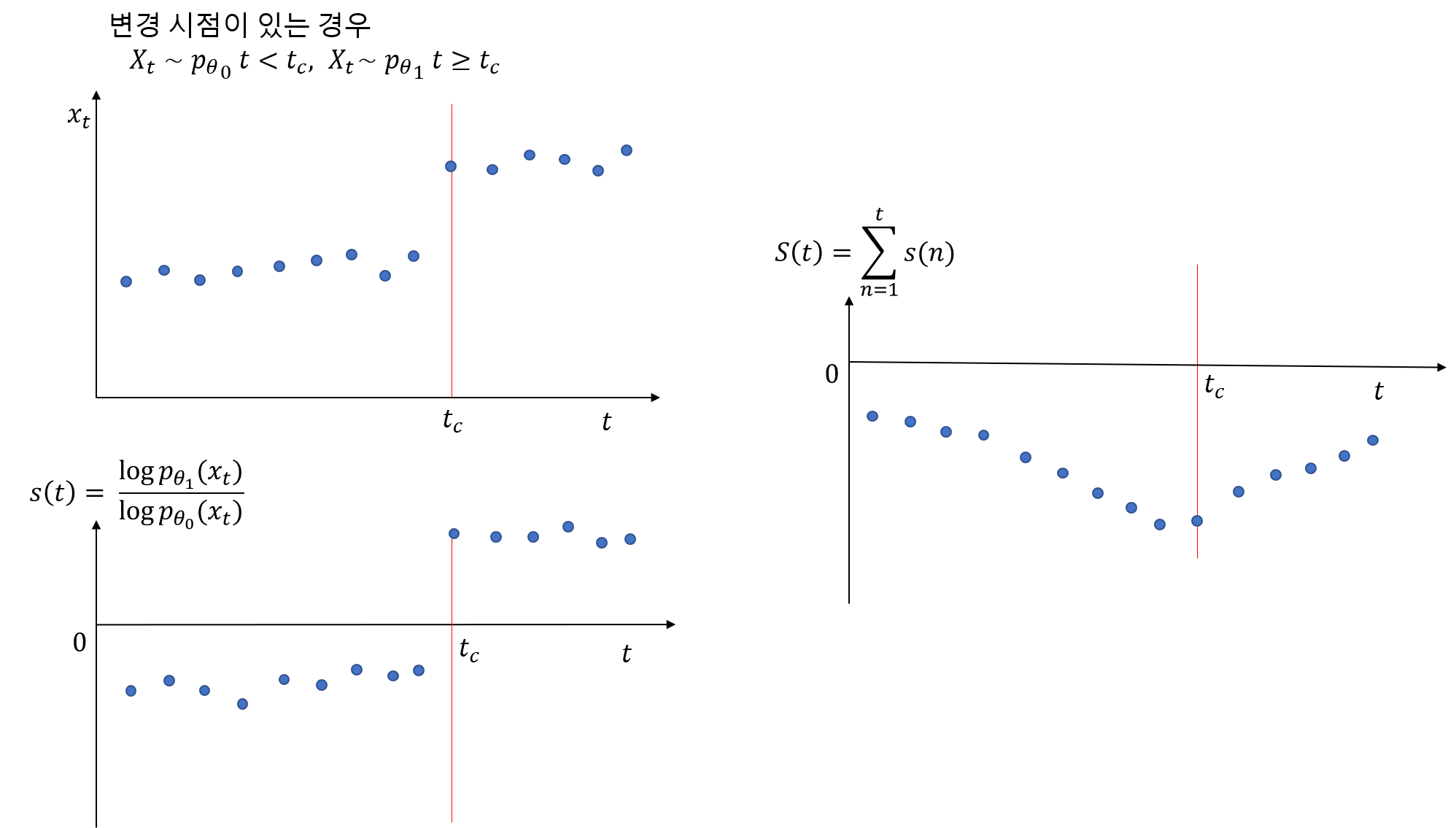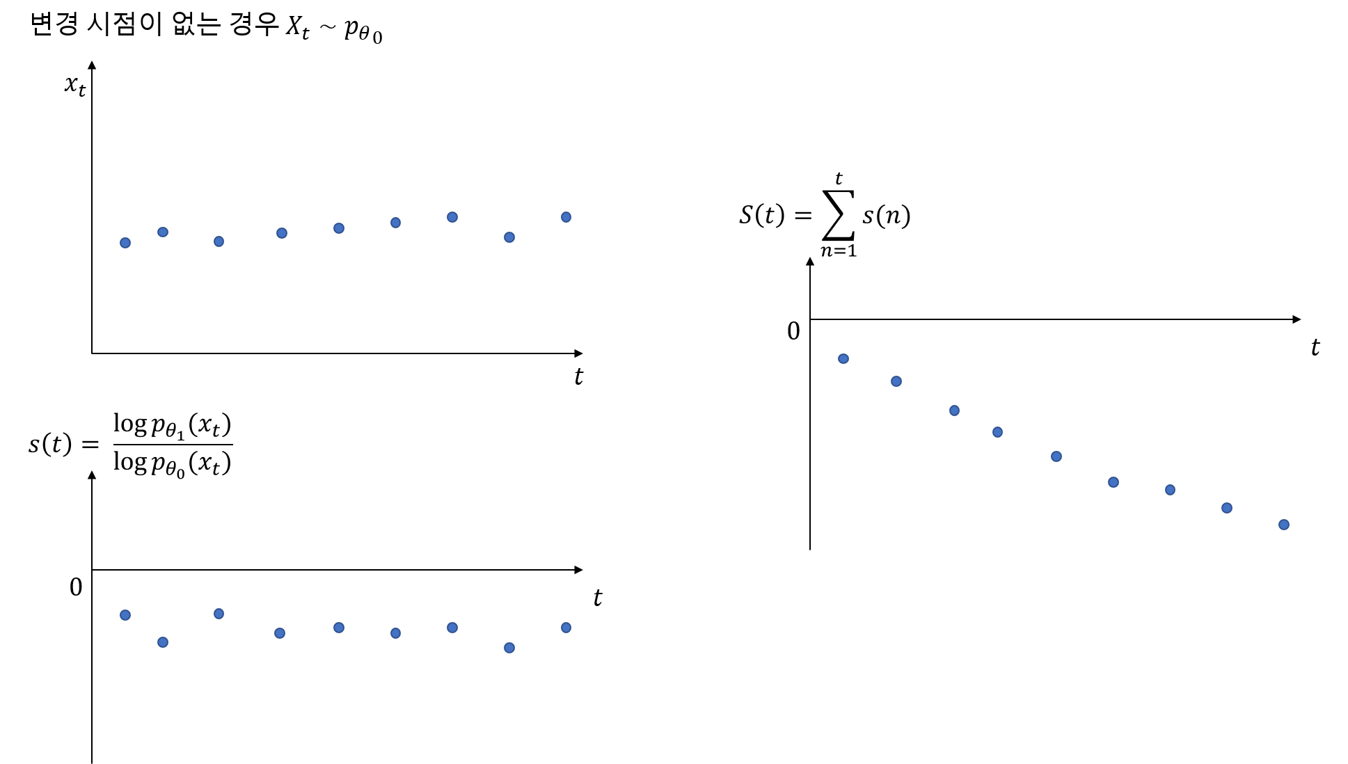 하지만 특정 변경점이 있어서 그 변경점 이후부터는 $X_t$의 확률 밀도 함수가 $p_{\theta_1}(x_t)$로 바뀌므로 개별 로그 우도비 $s(t)$은 양수로 전환되며 이때부터는 $S(t)$가 커지기 시작한다.