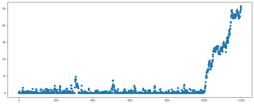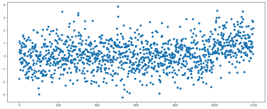 이제 모의실험을 해보자. 먼저 아래와 같이 1200개의 랜덤 난수를 생성하는데 1000개는 표준 정규분포를 따르고 뒤에 200개는 평균과 분산이 1인 정규분포를 따르는 난수로 구성했다. 이를 시각화하면 다음과 같다.