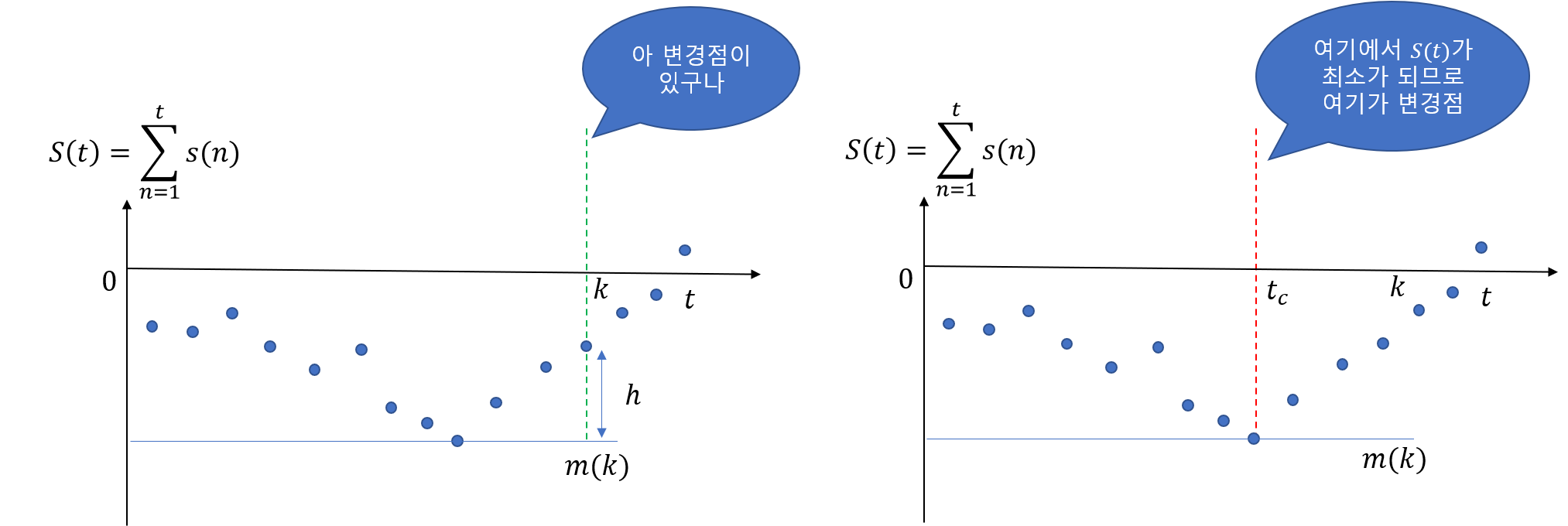 여기서 헷갈리지 말아야 할 것은 만약 $S(t) > m(t)+h$를 만족하는 시점 $t$가 $k'$인 경우 $k'$가 변경점이 되는 것은 아니다. (12)가 의미하는 것은 변경점을 구하는 것이 아닌 변경점이 존재하는지를 알려주는 것이다. 변경점은 첫 시점부터 $k'$ 사이에 대하여 $S(t)$가 최소가 되는 지점이 변경지점으로 추정한다.