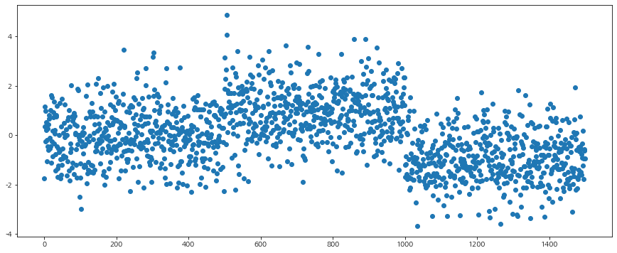 이번에는 변경점을 두 개가 있는 난수 시계열을 만들었다. 여기서는 499, 999번째 인덱스에서 변경이 일어난다.