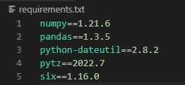 그러면 위 명령을 실행한 경로에 requirements.txt가 생성된 것을 알 수 있다. requirements.txt를 열어보면 다음과 같이 위에서 본 패키지 목록이 적혀있는 것을 알 수 있다.