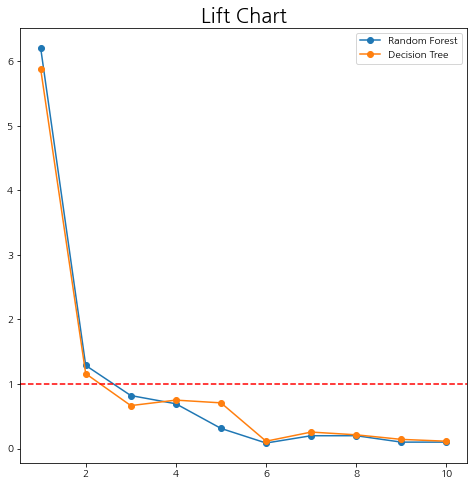 Lift Chart는 분류 모형을 사용하지 않았을 때보다 사용한 경우 얼마나 더 이익이 되는지를 시각적으로 나타낸 그림을 말한다. Lift Chart를 그리는 방법은 다음과 같다.