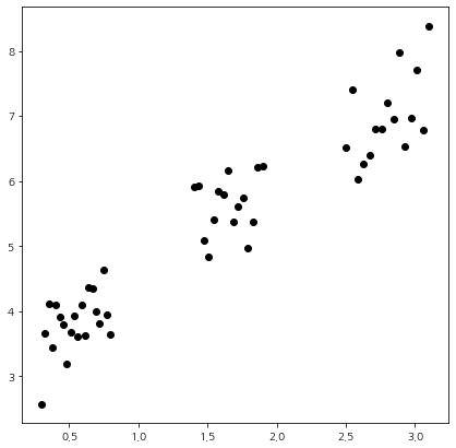 클러스터 개수가 3일 때 Calinski-Harabasz index가 최대인 것을 알 수 있다. 따라서 데이터를 만들 때 의도했던 대로 적정 클러스터 개수는 3을 정확히 맞춘 것을 알 수 있다.