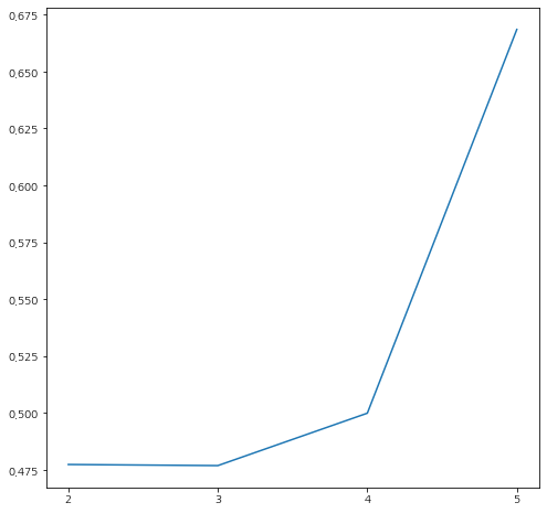 이번에는 클러스터 개수를 2~5까지 변화시키면서 Calinski-Harabasz index가 어떻게 변하는지 살펴보자.