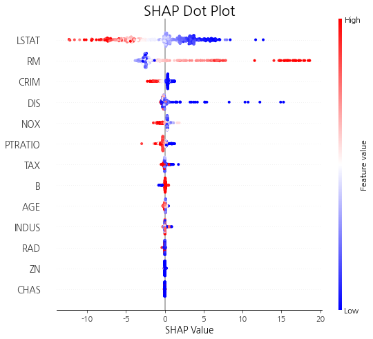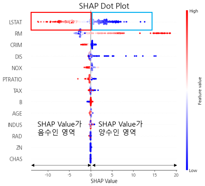 예를 들어 위 그림에서 LSTAT 변수는 SHAP Value가 음수인 곳에서 빨간색 점들이 압도적으로 많고 SHAP Value가 양수인 곳에서 파란색 점들이 많다.