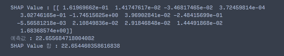 코드를 실행해 보았더니 예측값과 Base Value와 SHAP Value의 합이 약간의 차이를 보였다.