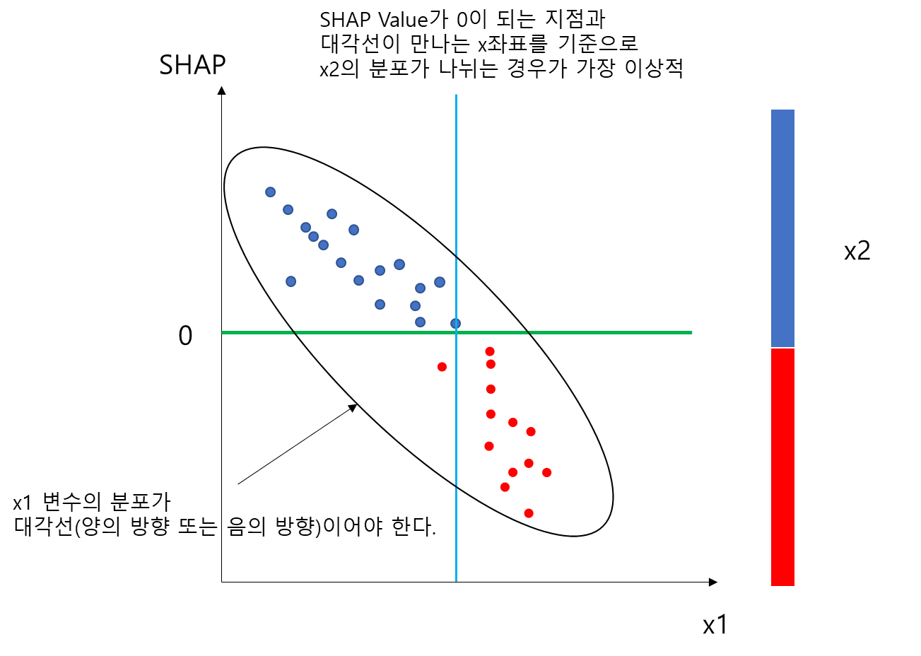 shap에서 그려주는 Dependence Plot을 확인할 때 가장 이상적인 경우는 아래와 같이 x축에 대응하는 변수가 SHAP Value에 대하여 대각선 분포(양의 상관관계 또는 음의 상관관계) 형태이고 이 대각선과 SHAP Value 값이 0이 되는 선이 만나는 대략적인 x좌표를 기준으로 교호작용을 확인할 변수의 분포가 나뉘는 것이다.