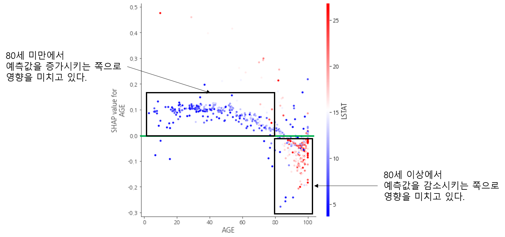 이때 80세 이상에서 LSTAT 값이 대체로 큰 것(빨간 점)을 알 수 있고 80세 미만에서 LSTAT값이 대체로 작은 것을 알 수 있다. 따라서 AGE 변수가 예측에 영향을 미치는 방향이 LSTAT 수준에 따라서 바뀌고 있다는 것을 알 수 있으며 이는 정확히 AGE 변수와 LSTAT 간의 교호작용(Interaction)이 있음을 뜻한다.
