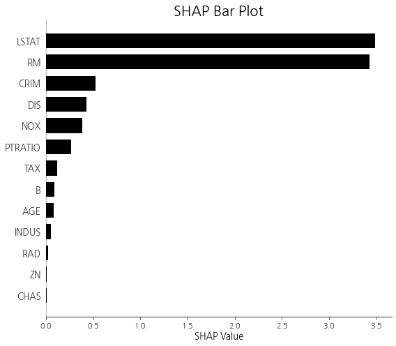 막대 그림(Bar Plot)에서 막대의 (가로) 길이는 개별 변수의 SHAP Value의 절대값 평균을 취한 것으로 글로벌한 예측 영향 정도이라고 생각할 수 있다. 따라서 어떤 변수에 대응하는 막대 길이가 길수록 글로벌한 예측 영향력이 크고 이는 예측에 있어서 중요한 변수라고 생각할 수 있다. 다만 점 그림(Dot Plot)과 같은 영향의 방향성 정보는 제공하지 못한다는 단점이 있다.